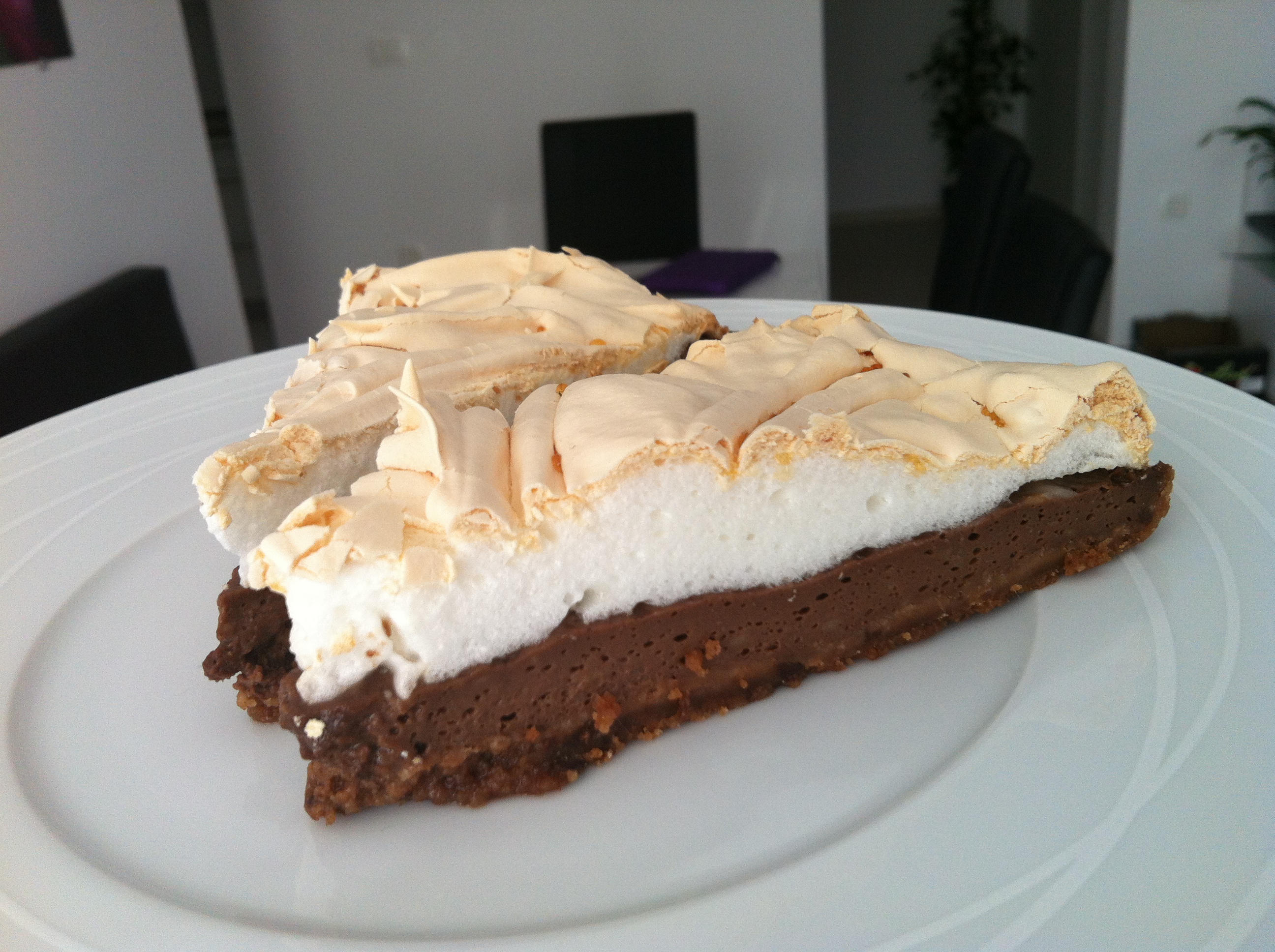5. Beljakovo maso stresi na nadev in z vilicami oblikuj vzorec. Peči 30 minut, da beljakova penica rahlo pozlati.