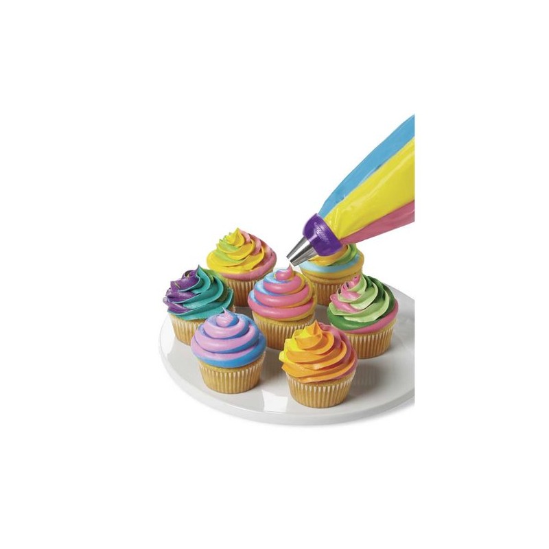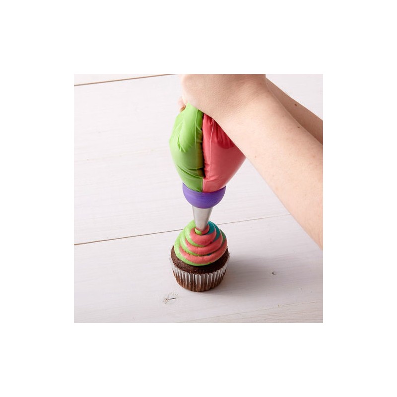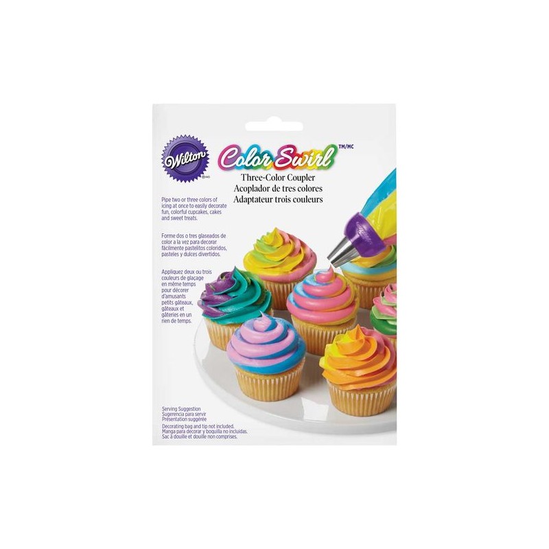 Wilton Color Swirl 3 Color Coupler je poseben nastavek/adapter za dekoracijo v katerega lahko hkrati vpneš kar 3 različne dresirne vrečke, torej kar 3 različne barvne kreme.