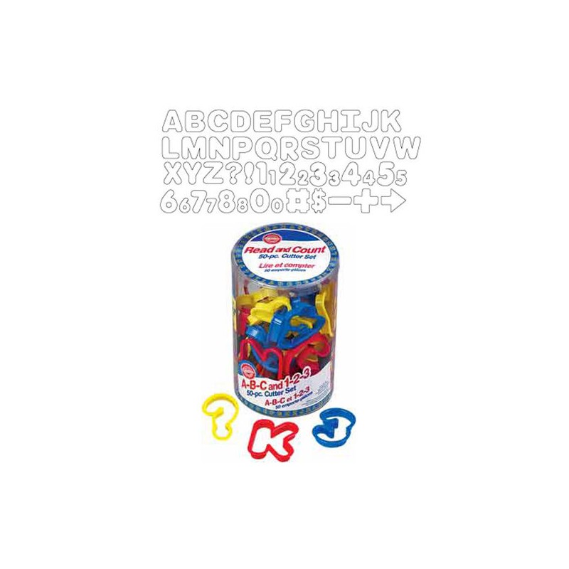 Komplet 50 plastičnih modelčkov za piškote v obliki črk, številk in znakov zapakiran v veliki plastični posodi.
