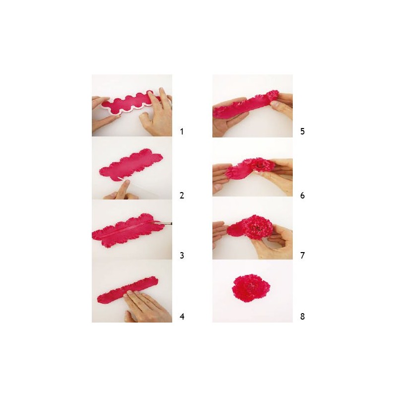 Izrežite obliko fondanta in uporabite orodje za risanje ter delajte vzdolž vseh odrezanih krivulj, tako da se zvijete naprej in nazaj, da ustvarite naboran rob. S čopičem nanesite črto užitnega lepila po dolžini paste tik nad sredinsko črto in prilepite drug na drugega. Fondant previdno zvijte v roko in razpognite cvetne liste. Če želite narediti večje nageljne, dodajte tretji trak cvetnih listov z istim rezalnikom in metodo.