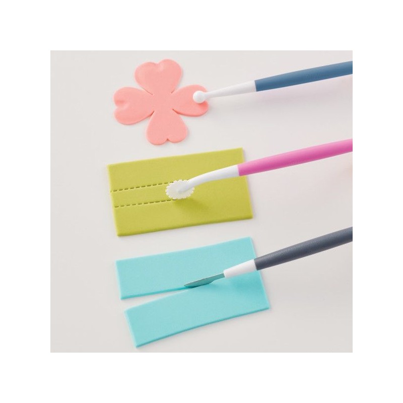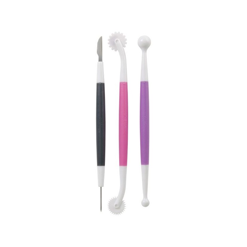 Tri orodja z dvojnim koncem olajšajo oblikovanje, detajliranje in rezanje fondanta ali gumi paste. Ta komplet vsebuje orodje s kroglico, orodje za prešivanje ter orodje za nož in iglo.